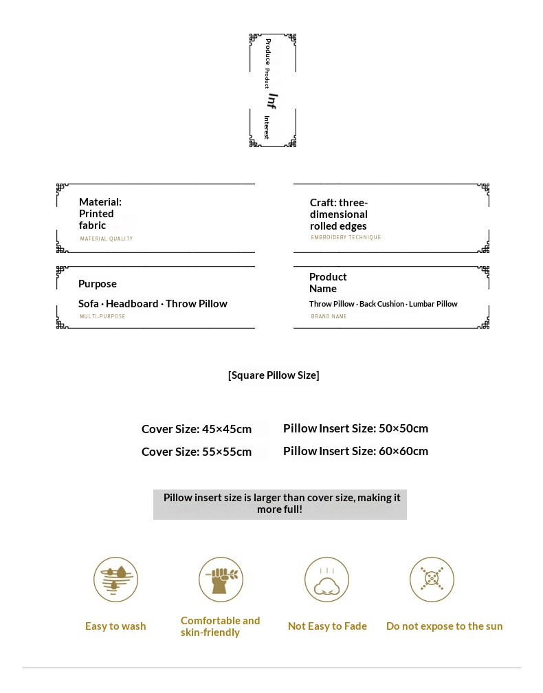Dimensions: 30 x 50 cm (pillowcase only), , 45 x 45 cm (pillowcase only), 45 x 45 cm , 60 x 60 cm (pillow cover only), 60 x 60 cm, 70 x 70 cm (pillow cover only), 70 x 70 cm